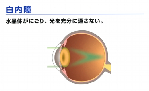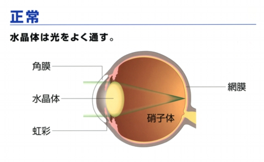 水晶体は目の中でレンズの役割をする組織です。正常な水晶体はほぼ透明で必要な光を良く通しますが、水晶体が濁ると光が十分に通らなくなります。これが「白内障」です。主な原因には加齢があります。