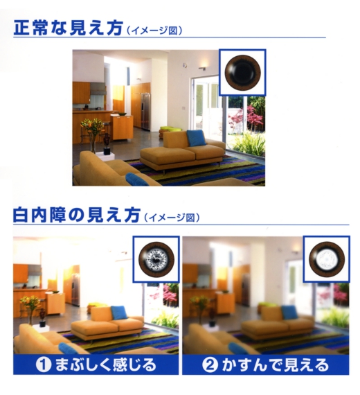 主な白内障の症状には、明るい所で眩しくて見にくい、物がかすんで見えるなどがあります。水晶体の濁りかたはその方によって異なるので、症状は様々です。